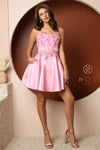 **SKU:** T718 **Brand:** Nox Anabel **Key Features:** * Sleeveless fitted bodice * Wide scoop neckline * Dual spaghetti straps * Crisscross lace-up tie design on open back * Intricate lace appliques on bodice * Sheer A-line silhouette skirt * Short hemline **Occasions:** * Formal...- $155.00