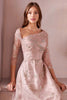 This stunning asymmetrical neckline gown exudes elegance and grace. The bodice and shoulder sleeves are adorned with an intricate pleated design, creating a captivating visual effect. The quarter-length sleeves offer a touch of modesty, while the fit-and-flare silhouette ensures a flowing and fashionable statement. The distinct and eye-catching style of this dress embodies sophistication and allure. The finishing touch is a full back zipper that provides seamless closure while maintaining the dress's flawless appearance.