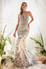 The enchantment continues with stunning 3D floral appliqués and feathers adorning the mermaid skirt, creating a breathtaking and dramatic effect that captivates with every graceful movement. The intricate beading and embroidery add a touch of opulence, making this dress a true masterpiece.
