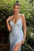 The Allure Elegant Gown effortlessly combines simplicity and chic style, offering a sophisticated and mature appearance. The bodice showcases a daring plunging V-neckline supported by delicate spaghetti straps, while the lace-up back adds a touch of allure. The entire gown is embellished with intricate beads and sequins, forming exquisite floral motifs that shimmer and sparkle. The skirt gracefully flows to the floor, accompanied by a gentle brush of train. Additionally, the skirt features a high slit, adding a captivating element that enhances the overall stunning effect.