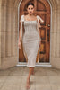 This exquisite gown is adorned with intricate lattice-patterned beadwork, creating a visually stunning effect. Its straight-across neckline and bustier-inspired bodice evoke a sense of elegance and allure. The gracefully cascading bows on the shoulders add a touch of charm, while the sheath skirt flows gracefully, revealing high side slits that provide both movement and a modern edge. The skirt tapers down to a tea-length hemline, creating a sophisticated and refined look that is perfect for any special occasion.