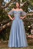 Prepare to captivate in this ethereal gown from Allure. Its shimmering glitter tulle fabric dances with light, while the off-the-shoulder puff sleeves and sheer bodice adorned with floral embellishments add an air of timeless sophistication. The bodice hugs your curves perfectly, flaring out at the waistline to create a luminescent volume that will turn heads. Whether you're gracing the dance floor or attending a formal dinner, this glamorous creation is sure to make a lasting impression.