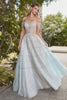 Immerse yourself in the ethereal beauty of this exquisite gown. Adorned with a delicate scattering of beads and graced by a lattice motif embellishment, it exudes an air of timeless elegance. The off-shoulder neckline and dainty short sleeves accentuate the shoulders, while the mid-rise back and seamless zipper closure ensure a flattering fit. The skirt captivates with a mesmerizing cascade of beads, with a lace underlayer peeking through for a touch of allure. A diaphanous overlay adds an ethereal touch, crafting a resplendent A-line silhouette that culminates in a gracefully trailing train.