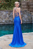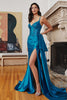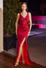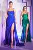 Step into the spotlight and make your fantasy a reality in this captivating Cinderella Divine masterpiece. Shimmering rhinestone details adorn the impeccably tailored bodice, exuding elegance with its scoop neckline and delicate spaghetti straps. The mid-rise back adds a touch of allure, while the ruched panels along the midriff accentuate your curves. A cascading sash gracefully flows atop the high-slit sheath skirt, leading to a dramatic sweeping train. Be the belle of the ball in this enchanting creation, perfect for any glamorous event where you want to shine.