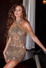 Prepare to steal the show in this captivating Portia and Scarlett cocktail dress. Its form-fitting bodice and high halter neckline create a striking silhouette that commands attention. Adorned with sparkling embellishments and delicate dangling adornments, this ensemble exudes glamour and sophistication. The sultry mesh inset at the midriff adds a touch of allure, while the fitted skirt descends to a mid-thigh hem, showcasing your legs. This alluring party dress is guaranteed to ignite passion and desire, making you the center of attention at any event.