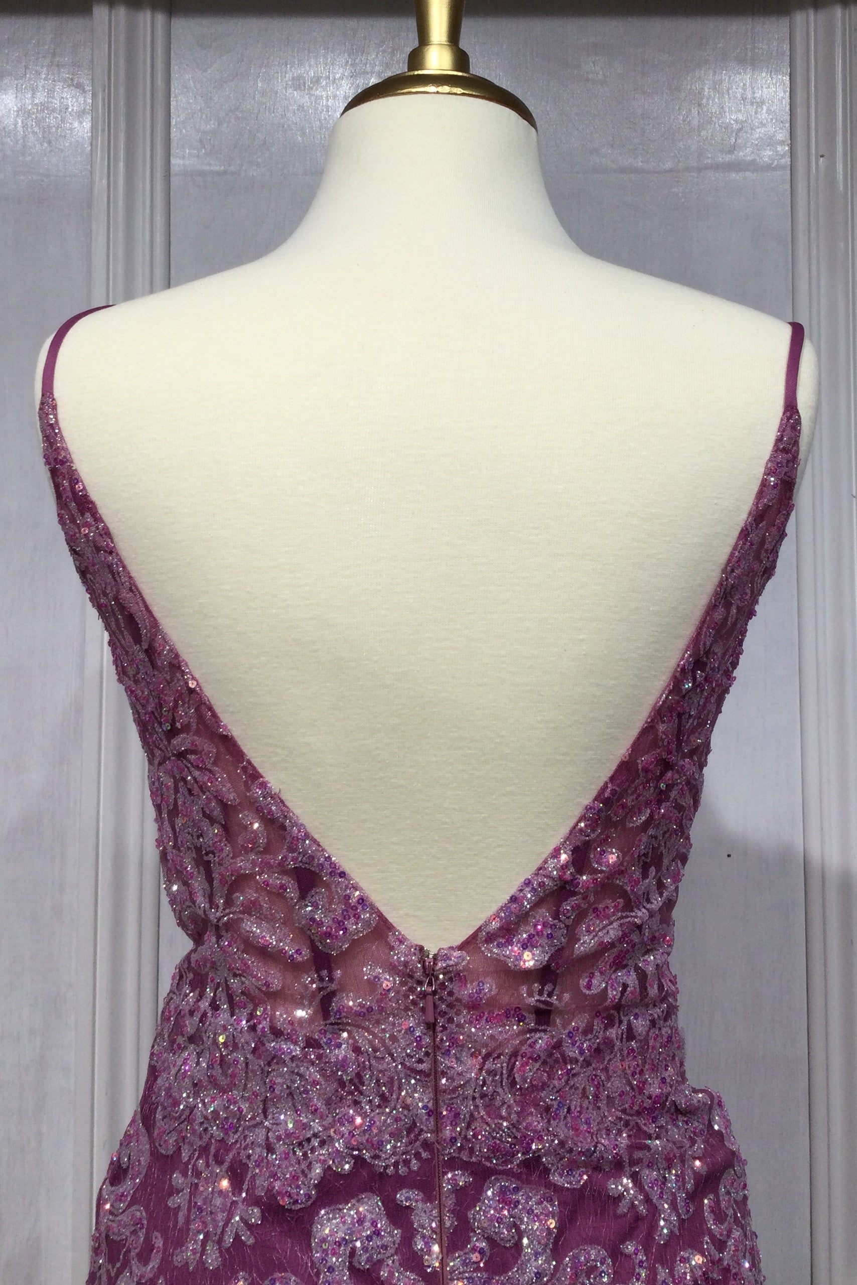 * Plunging V-neckline with sheer inset for a tasteful focal point