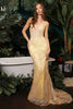 Radiate elegance and poise as you make a captivating entrance in the stunning Cinderella Divine CC2189 creation. Embellished with an intricate and shimmering motif that adorns its entire length, this gown is a true masterpiece of glamour. The figure-flattering design features a plunging V-neckline adorned with a sheer inset, creating a tasteful and alluring focal point. The delicate spaghetti straps add a touch of refinement to the look. The sculpted silhouette of the mermaid skirt gracefully contours your curves and culminates in a sweeping and dramatic train, exuding an aura of sophistication and allure. Perfect for making a statement at any special event, this Cinderella Divine gown is a must-have for those who appreciate timeless beauty and style.