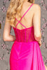 The floor-length sheath skirt features a high-high slit that accentuates your every move, complemented by a sweeping train that adds a dash of drama. Available in Fuchsia and Royal Blue hues, this exquisite creation will turn heads wherever you go. Embrace the epitome of charm and allure in this unforgettable evening gown.