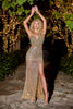 Prepare to captivate the crowd in this exquisite Portia and Scarlett PS23721c gown. Adorned in a cascade of iridescent sequins and shimmering beads, this dress exudes an aura of regal splendor. The sleeveless bodice boasts a flattering V-neckline and sheer side cutouts that hint at a touch of allure. Dual spaghetti straps provide comfortable support, ensuring you feel confident and radiant throughout the night.