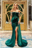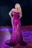 Prepare to captivate with this exquisite Portia and Scarlett gown. Its alluring off-shoulder neckline, adorned with shimmering beadwork, creates a graceful short-sleeve effect. The fitted silhouette beautifully showcases an asymmetrical ruched bodice, complemented by a high slit that adds a touch of drama. The sheath skirt elegantly tapers to full length, enhanced by a flowing train and a captivating side overlay drape accent. The back reveals a mid-open design, providing both style and convenience with its zipper closure. This Portia and Scarlett masterpiece is crafted to make you feel like a goddess, leaving an unforgettable impression on any occasion.