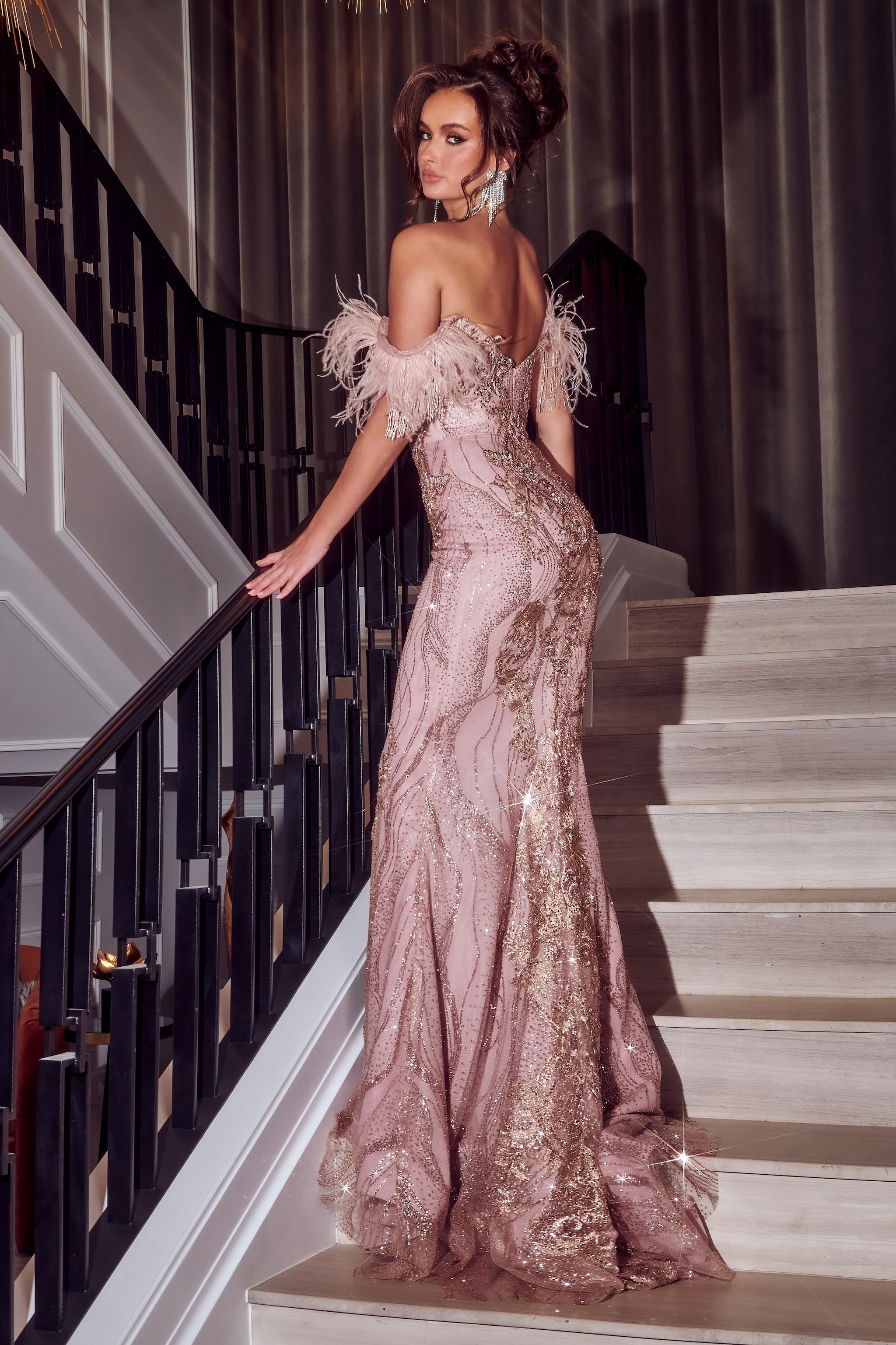 Step into the spotlight in the exquisite Portia and Scarlett PS23306 gown. This masterpiece is adorned with sparkling beadwork that shimmers under the lights, ensuring you turn heads wherever you go. Its sweetheart neckline and low-cut back create an alluring silhouette, while the dramatic off-shoulder sleeves with feathers and fringed lace add a touch of ethereal elegance. The full-length mermaid skirt flows effortlessly with godets, culminating in a breathtaking sweep train that will leave a lasting impression. Available in the captivating Rose Gold color, this gown is the epitome of sophistication and glamour. Prepare to make a memorable entrance and leave an unforgettable mark in the Portia and Scarlett PS23306 gown.