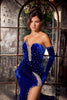 Prepare to captivate at your next evening affair with the exquisite Portia and Scarlett PS23672 evening dress. Its shimmering sequin fabric, adorned with delicate lace appliqué and sparkling rhinestones, creates an unforgettable impression. The strapless design and V-neckline exude elegance, while the floor-length sheath silhouette accentuates your curves. A high slit adds a touch of allure, and a sweep train completes the look with a touch of glamour. Available in a captivating Purple hue, this dress is the epitome of sophistication and style.