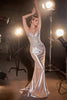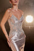 Illuminate the night in this radiant fitted evening gown that promises to captivate from the moment you step into the room. The slim silhouette ensures you'll be a showstopper, drawing admiring glances in every direction. The sheer boned bodice is adorned with exquisite lace appliqués, adding a touch of allure, while the thin straps offer a confident and comfortable fit. The glitter stretch satin skirt is both romantic and striking, destined to make your partner swoon. The pleated bust cups provide an extra layer of sophisticated glamour, making this dress an ideal choice for prom nights or any special occasion. Get ready to shine on the dance floor in this dazzling fitted evening gown.