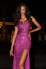 The high leg slit adds a touch of flirtatiousness, revealing just enough to captivate. The full-length sheath silhouette flatters the figure, elongating the legs and creating a statuesque appearance. The horsehair hem and sweeping train add an air of timeless elegance, making this gown perfect for any formal occasion where you desire to make a bold and unforgettable statement.