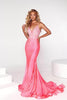 Prepare to captivate the night in this exquisite Portia and Scarlett masterpiece. The PS22518 dress is a symphony of glamour and sophistication. Its plunging V-neckline, adorned with a subtle illusion panel, exudes allure. Delicate spaghetti straps accentuate the shoulders, while the sheer open back with diamond cutout adds a touch of intrigue.