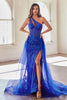 Step into a realm of enchantment with this captivating one-shoulder gown. Its fitted silhouette accentuates your curves, while the sheer boned bodice exudes sophistication. The unique design of the one-shoulder tulle keyhole adds a touch of intrigue, and the layered tulle overskirt flows gracefully, creating a vision of ethereal elegance.