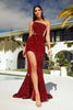 Indulge in the epitome of elegance with this exquisite Portia and Scarlett gown. Its shimmering sequins dance across the fabric, illuminating your every move. The one-shoulder neckline and delicate spaghetti strap exude sophistication, while the sheer side panels add a touch of alluring mystery. The mermaid skirt contours your figure perfectly, flowing into a captivating sweep that will leave a lasting impression. Available in a vibrant palette of Burnt Orange, Magenta, Navy, Ocean Blue, Purple, and Red, this chic creation will elevate your evening to new heights.