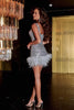Step into the spotlight with this exquisite Portia and Scarlett PS23018 cocktail dress. Its intricate beading and sequins create a dazzling display that will turn heads. The fitted bodice with a square neckline and delicate straps exudes elegance, while the mid-thigh hemline and feather details add a touch of whimsy. Perfect for making a grand entrance at any special occasion, this dress is sure to leave a lasting impression.