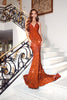Prepare to captivate all eyes in this exquisite Portia and Scarlett gown. Its opulent sequin velvet bodice shimmers with an iridescent effect, creating a mesmerizing allure. The deep V-neckline and thick shoulder straps exude elegance, while the open back with crisscross straps accentuates your figure. The flowing mermaid skirt cascades into a breathtaking train, ensuring a grand entrance. Available in a vibrant palette of Blue, Burnt Orange, Gold, Magenta, Purple, and Red, this masterpiece will transform you into the center of attention at any formal occasion.
