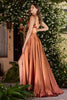 Illuminate the room with your presence in this exquisite Cinderella Divine BD105 creation. This captivating gown embodies elegance and allure, making you the center of attention. The delicate spaghetti straps lead to a plunging V-neckline that frames your figure beautifully. The soft draping adds a touch of romance to the design, while the tie straps and open back infuse a contemporary twist into the classic silhouette. As you move, the draped slit reveals a glimpse of leg, adding a hint of sensuality to the ensemble. The skirt flows gracefully, culminating in a sweeping train that adds an element of drama to your every step. You'll be sure to capture that twinkle in his eyes and leave a lasting impression.