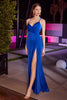 Command the spotlight in the captivating allure of Cinderella Divine BD4002. This chic sleeveless gown features a wrap-style bodice that highlights your décolletage, while delicate spaghetti straps gracefully transition into a lace-up tie at the back. A touch of elegance is found in the ruched detail atop the zipper closure. The full-length skirt skims your figure in a flattering sheath silhouette, while a daring thigh-high leg slit adds a hint of drama and movement. Make a statement that leaves a lasting impression as you step into any event wearing this captivating Cinderella Divine creation.