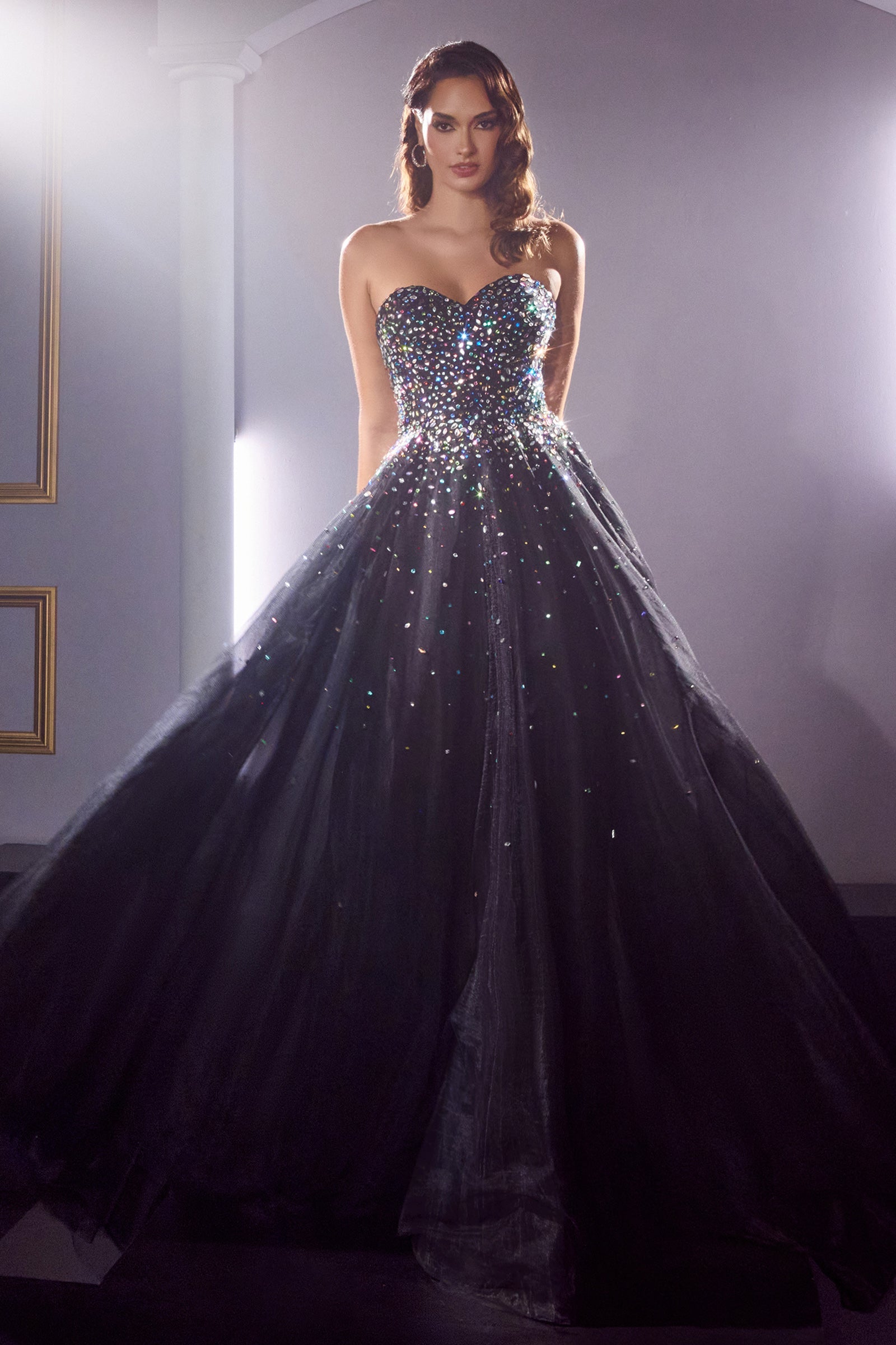 Step into the spotlight with confidence in this breathtaking Cinderella Divine CB114 evening gown. This masterpiece features a voluminous A-line silhouette that flatters every figure. The strapless design showcases a captivating sweetheart neckline adorned with a dazzling array of multicolored beads. The gown's back features a stylish mid-cut detail and is secured with a discreet zipper closure. The enchanting look is completed by a sweep train that adds a touch of drama to your entrance. Make a lasting impression and own the limelight in this awe-inspiring creation.