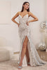 Elevate your presence to a celestial level with the Cinderella Divine CDS421. This exquisite gown is adorned with an array of shimmering sequins that gracefully envelop its tailored silhouette. The captivating deep V-neckline is supported by delicate spaghetti straps, while sheer embellished accents on the sides add an enchanting touch. The lace detailing on the back enhances the ethereal allure of this gown. The glimmering sequins catch the light from every angle, creating a luminous effect that will turn heads wherever you go. The mermaid skirt completes the look with a daring high slit that adds a hint of allure, sculpting your figure before cascading into a sweeping train. This gown is sure to leave a lasting impression on any occasion.