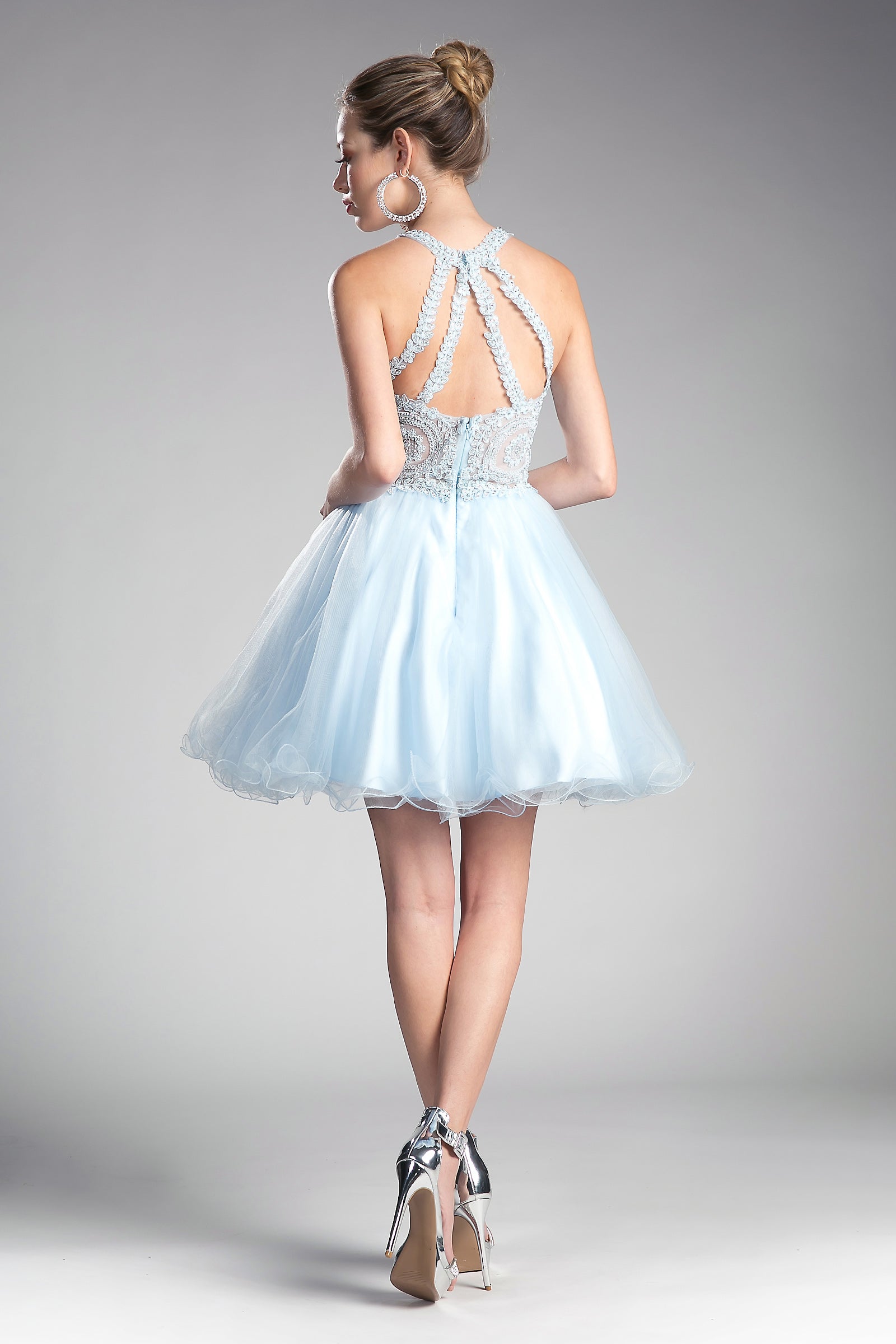 Step into a realm of timeless elegance and vintage allure with the Cinderella Divine UJ0119 creation. This exquisite dress boasts lavish beaded lace appliques on the bodice, adding a touch of sophistication. The cut-in shoulders and jewel neckline evoke a sense of classic beauty, while the corded lace strappy back adds a unique and captivating detail. The short hem rolled tulle skirt brings a playful and flirtatious element to the design, ensuring you'll be the center of attention on the dance floor. With its graceful charm and stunning style, this dress will captivate everyone you meet.