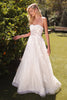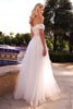 Walk down the aisle like an enchanting vision in the captivating Cinderella Divine A1103W creation. This masterpiece of design features a sheer corset bodice adorned with intricate embroidered details that exude opulence. The sweetheart neckline adds a touch of romance, while the mid-rise back design complements the overall elegance. The gown is further enhanced with floral lace along its removable puff arm bands, enhancing its ethereal beauty. The lush skirt showcases tiers of delicate tulle that gracefully flow to the floor, culminating in a mesmerizing trailing train. Embrace a romantic and captivating flair on your wedding day with this exceptional creation.
