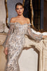 Ladivine Off Shoulder Fringe Prom Dress Beaded Slit Evening Gown CC324 Black/Nude