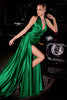 * Fitted satin halter gown with a leg slit