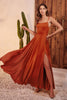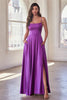 Create an unforgettable look with this timeless satin A-line gown. Its classic silhouette, delicate thin straps, and luxurious satin fabric combine to create a stunning masterpiece that will leave a lasting impression. The straight neckline flatters various body types, while the corset-style lace-up back adds a touch of sophistication. A contemporary leg slit provides extra movement, seamlessly blending modern flair with classic allure. Whether you're seeking the perfect bridesmaid dress or an elegant gown for a formal event, this piece ensures timeless grace and enduring style.