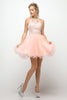 Embody timeless elegance and vintage allure in the Cinderella Divine UJ0119 creation. This exquisite dress boasts intricate beaded lace appliqués on the bodice, adding a touch of opulence. The cut-in shoulders and jewel neckline exude sophistication, while the corded lace strappy back adds a unique and captivating detail. The short hem rolled tulle skirt brings a playful and flirtatious element, ensuring you'll be the center of attention on the dance floor. Captivate everyone with your graceful charm and stunning style in this unforgettable masterpiece.