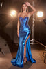 Indulge in the allure of this exquisite fitted satin gown by Cinderella Divine. Its strapless design and boned corset bodice will accentuate your curves and create a captivating hourglass figure. The gathered hip area and side leg slit add a touch of sensuality, while the lace-embellished bust cup detail exudes sophistication and glamour.