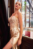 Metallic lace appliques adorn the bodice, creating a mesmerizing texture and shimmer that will turn heads. The full-length satin sheath skirt elegantly opens up with a high leg slit, revealing a hint of skin while adding a touch of sexiness. The skirt culminates in a graceful sweep train that adds a touch of glamour and drama to this enchanting creation.
