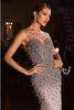 Step into the spotlight in this enchanting gown from Cinderella Divine. The sleeveless design and plunging V-neckline create an alluring silhouette that draws all eyes to you. The fitted bodice is elegantly adorned with a delicate array of stones and jewels, adding a touch of opulence to your look. The low V-back adds an extra hint of sophistication, while the mermaid skirt cascades with a festive flutter of feathers, infusing the ensemble with a joyful spirit. The concealed back zipper ensures a secure fit, and the skirt flows gracefully into a sweep train finish, capturing attention with every step. Whether you're seeking a unique and standout prom dress, elegant bridesmaid attire, or a captivating Mother of the Bride ensemble, this dress promises to make your special day truly memorable.