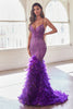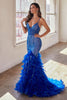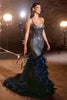 Embrace the epitome of glamour and allure in this captivating Cinderella Divine mermaid gown. Crafted with thin straps and a plunging V-neckline, it effortlessly flatters your figure and highlights your beauty. The sheer boned bodice provides structure while creating a slimming silhouette that gracefully cascades into a luxurious tiered skirt adorned with feathers. For an extra touch of opulence, delicate glitter and beads are meticulously sprinkled across the fitted silhouette, culminating in an open lace-up corset back. With this exquisite gown, you'll command attention and leave an unforgettable impression wherever you go.