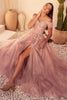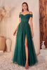 Indulge in the ethereal beauty of this off-the-shoulder tulle ballgown by Cinderella Divine. Its captivating A-line silhouette is adorned with intricate lace detailing on the bodice, creating a mesmerizing effect. The sheer and boned neckline gracefully reveals a sweetheart neckline, exuding both elegance and allure. A stylish leg slit and a glittering tulle skirt with cascading lace appliqués complete this enchanting ensemble. Step into the spotlight like royalty in this half-draped tulle ballgown, where your presence will embody timeless beauty and sophistication.