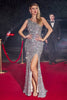 Ladivine Off Shoulder Fringe Prom Dress Beaded Slit Evening Gown CC324 Black/Nude