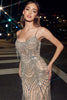 Prepare to turn heads and make a bold statement in this breathtaking Cinderella Divine CD866 dress. This exquisite gown is the epitome of elegance, designed to make you shine and shimmer at any event. Its fitted mermaid silhouette beautifully accentuates your curves, while the stunning silver embellished tulle overlay adds a touch of glamour and sophistication. The nude lining beneath provides subtle contrast, highlighting your figure. Delicate thin straps and a scoop neckline complete the look, while dangling fringe and rhinestone details catch and reflect light, ensuring you'll be the center of attention with every step you take. With this glamorous gown, you're guaranteed to make an unforgettable and impactful entrance every time you grace an event with your presence.