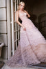 Embrace the epitome of ethereal beauty with this enchanting gown. Its meticulously tailored bodice hugs your form flawlessly, while the strapless corset neckline gracefully converges into a captivating rear view. The alluring attire features an exquisite arrangement of elegant tulle tiers that cascade down the length of the full-skirted masterpiece, their gentle ruffles adding a touch of whimsy. The stunning design emphasizes a striking flared silhouette, creating a sense of movement and grace as the gown descends to a delightful sweep train, leaving an unforgettable impression.