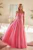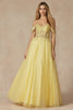 Embrace the epitome of femininity in this breathtaking off-the-shoulder embroidered tulle prom gown. Its intricate floral embroidery dances across the bodice and skirt, creating a captivating visual masterpiece. The ethereal tulle fabric flows effortlessly, enveloping you in a cloud of enchantment. With its built-in bra cups and comfortable fit, you'll feel confident and radiant all night long. Whether you're attending prom, a formal event, or any special occasion, this gown will transform you into a vision of grace and sophistication.