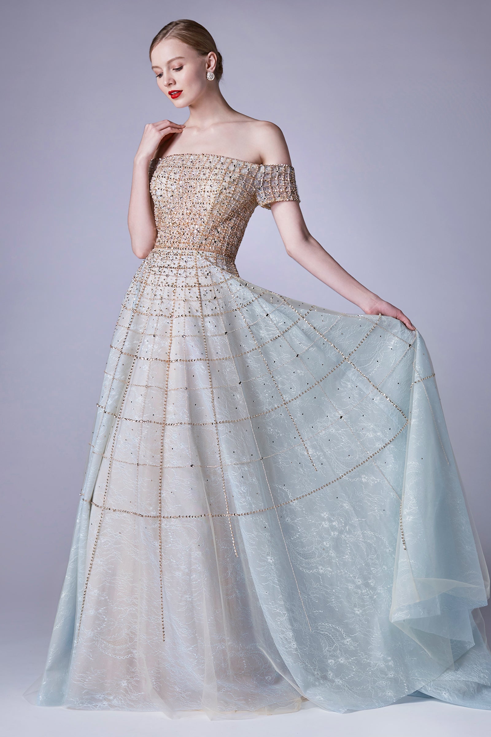 Indulge in the ethereal beauty of this exquisite gown from Elegancia. Adorned with a delicate scattering of beads and graced by a lattice motif embellishment, this masterpiece exudes elegance and sophistication. Its off-shoulder neckline and dainty short sleeves create a flattering silhouette, while the mid-rise back and seamless zipper closure ensure a comfortable fit. The skirt is a captivating cascade of beads with a lace underlayer peeking through, creating a mesmerizing effect. A diaphanous overlay adds an ethereal touch, crafting a resplendent A-line silhouette that culminates in a gracefully trailing train. Perfect for weddings, formal events, and special celebrations, this gown will turn heads and leave a lasting impression.