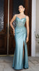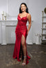 Shop this embroidered satin high slit gown at The Dress Nova in the following colors: