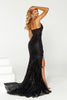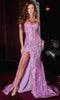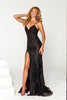 Step into the limelight in this captivating Portia and Scarlett gown, a masterpiece inspired by the PS22531 dress. This radiant creation exudes glamour and charm with its intricate glitter spectacle embellished with sparkling rhinestones. The corset-boned bodice features a deep V-neckline, supported by delicate spaghetti straps, adding a touch of allure. A basque waist and sultry slit reveal a hint of leg, while the mermaid skirt sculpts your figure and flows gracefully to the floor. The elegant train adds a touch of grandeur, making this gown perfect for any special occasion where you want to capture the spotlight. Radiate elegance and dance the night away in this figure-flattering masterpiece.
