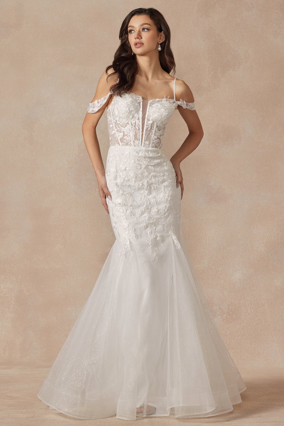* Intricate leaf lace embroidery adorns the bodice and skirt
