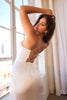 * Ruched accent on the thigh-high leg slit creates a captivating silhouette