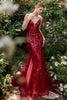 This breathtaking gown is a masterpiece of intricate embellishments and flowing elegance. The bodice is adorned with a mesmerizing interplay of sequins and lace appliqués, resembling a trailing foliage motif. The plunging V-neckline, accentuated by an illusion inset, adds a hint of allure, while the slender spaghetti straps lend a delicate touch. The back features a deep V-shaped open design, adding a touch of daring charm.