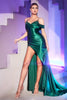 Embrace the spotlight in the enchanting Cinderella Divine CC2197 creation. Crafted from smooth satin, this gown features a tailored silhouette that beautifully enhances your curves. The attention-grabbing bejeweled bustier is elegantly suspended from delicate spaghetti straps, adding a touch of glamour to the ensemble. The off-shoulder straps adorned with fold-over accents lend an extra layer of sophistication. The skirt drapes gracefully and features a high slit that enhances the sheath silhouette, while a sumptuous train adds a touch of drama to your stride. As you ascend to the height of chic fashion, this Cinderella Divine gown guarantees a captivating presence that will have all eyes fixed on you.