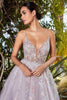 Resembling the beloved princess of your dreams, this exquisite attire features a plunging V-neckline and delicate botanical motifs on the transparent torso. Its generously layered A-line contour in lavish tulle, adorned with sparkling accents, exudes an ethereal charm. The gown concludes with a gracefully extended sweeping train, leaving a trail of enchantment in its wake.